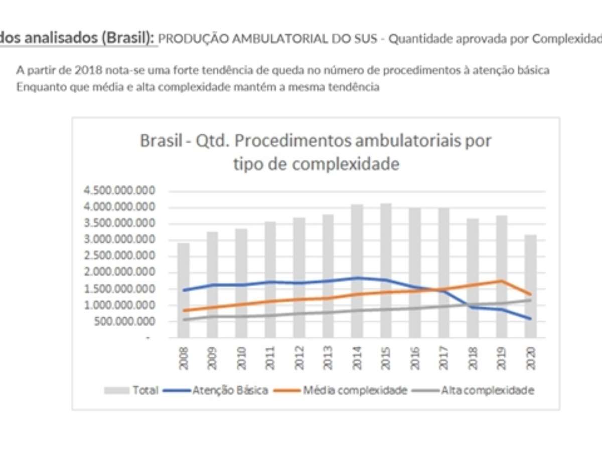 De maneira complementar, o estudo levantou a quantidade total de recursos (deflacionados) despendidos para procedimentos ambulatoriais (baixa, média e alta complexidade) ao longo dos últimos anos. Ao comparar 2008 com 2020, identificou-se uma queda real de 20% (cerca de R$ 4,9 bilhões). No entanto, a análise da série histórica mostrou que as reduções não foram lineares ao longo do período.