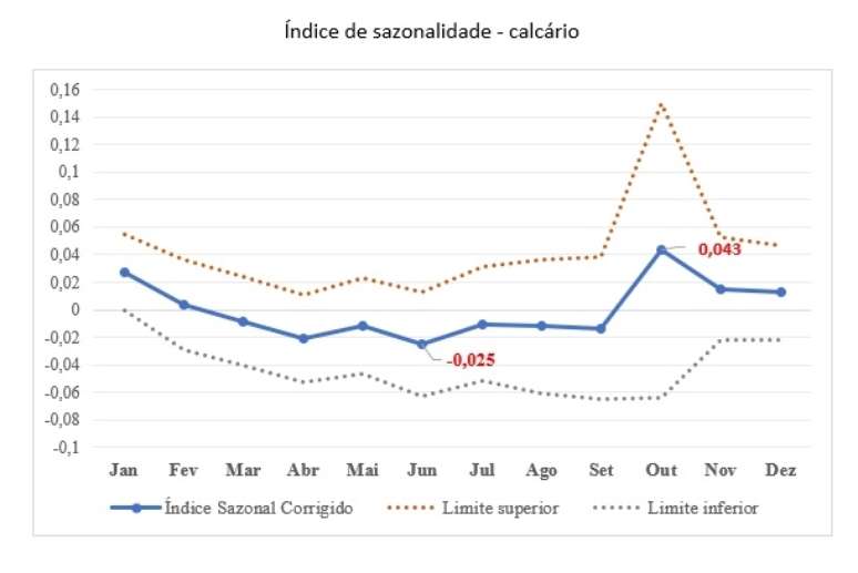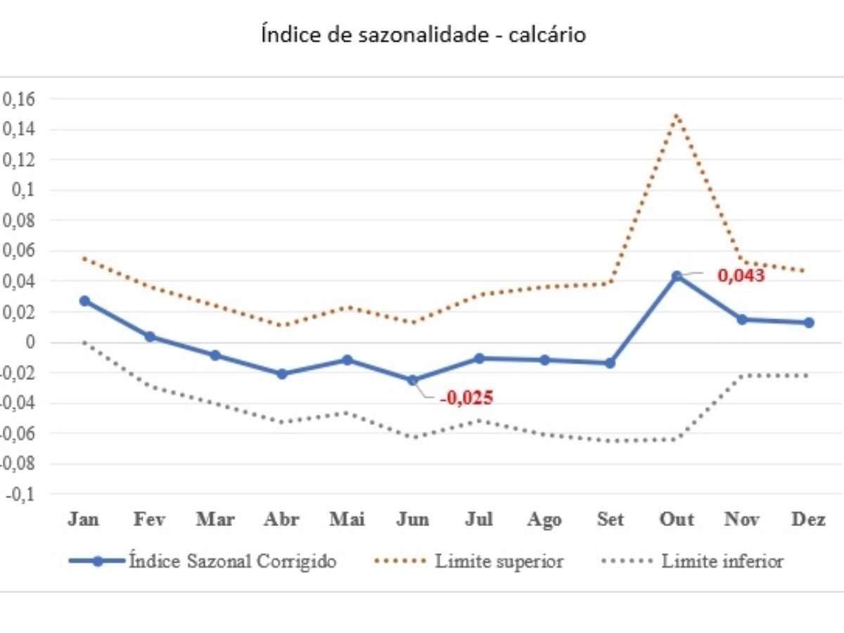 Já com o calcário, utilizado principalmente como corretivo de solo, os preços tendem a subir entre outubro e fevereiro - meses de maior precipitação e quando o insumo é normalmente mais utilizado. Os menores valores são observados entre abril e agosto.