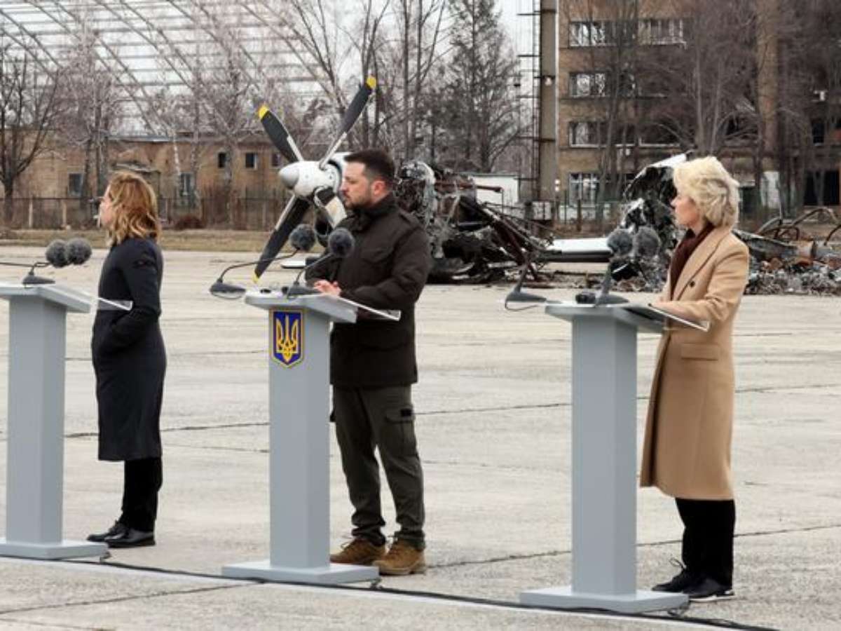 Os líderes visitaram o aeroporto de Hostomel, local de uma feroz batalha feroz no início da invasão, quando a Rússia lançou paraquedistas para tomar a capital, Kiev, a poucos quilômetros de distância.