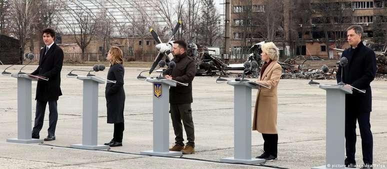 O presidente ucraniano, Volodimir Zelenski, abraçou os líderes ocidentais e fez um discurso televisionado em um cenário de aeronaves destruídas. "Há dois anos, enfrentamos as tropas inimigas aqui com fogo e, dois anos anos depois, estamos encontrando nossos amigos, nossos parceiros, aqui", disse.