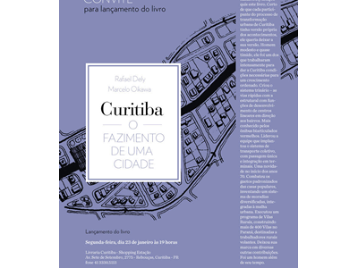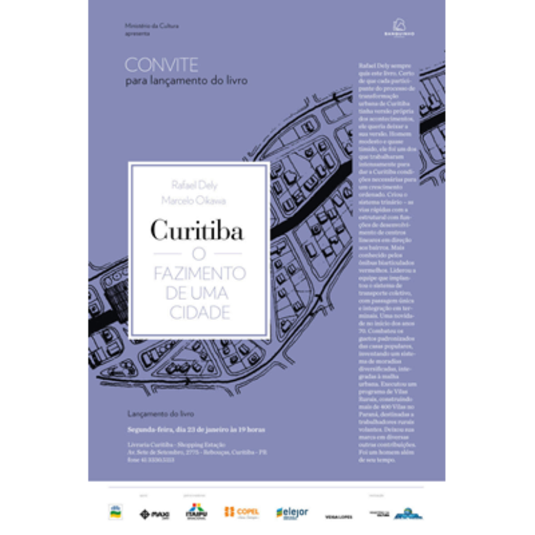 Até hoje não havia um livro que contasse a história da transformação urbana de Curitiba ou que sintetizasse as propostas e as realizações que moldaram a cidade. O livro "Curitiba, o fazimento de uma cidade", escrito pelo jornalista Marcelo Oikawa, a partir do depoimento do arquiteto e urbanista Rafael Dely, cobre esta lacuna, contando com leveza e simplicidade uma experiência de vida.