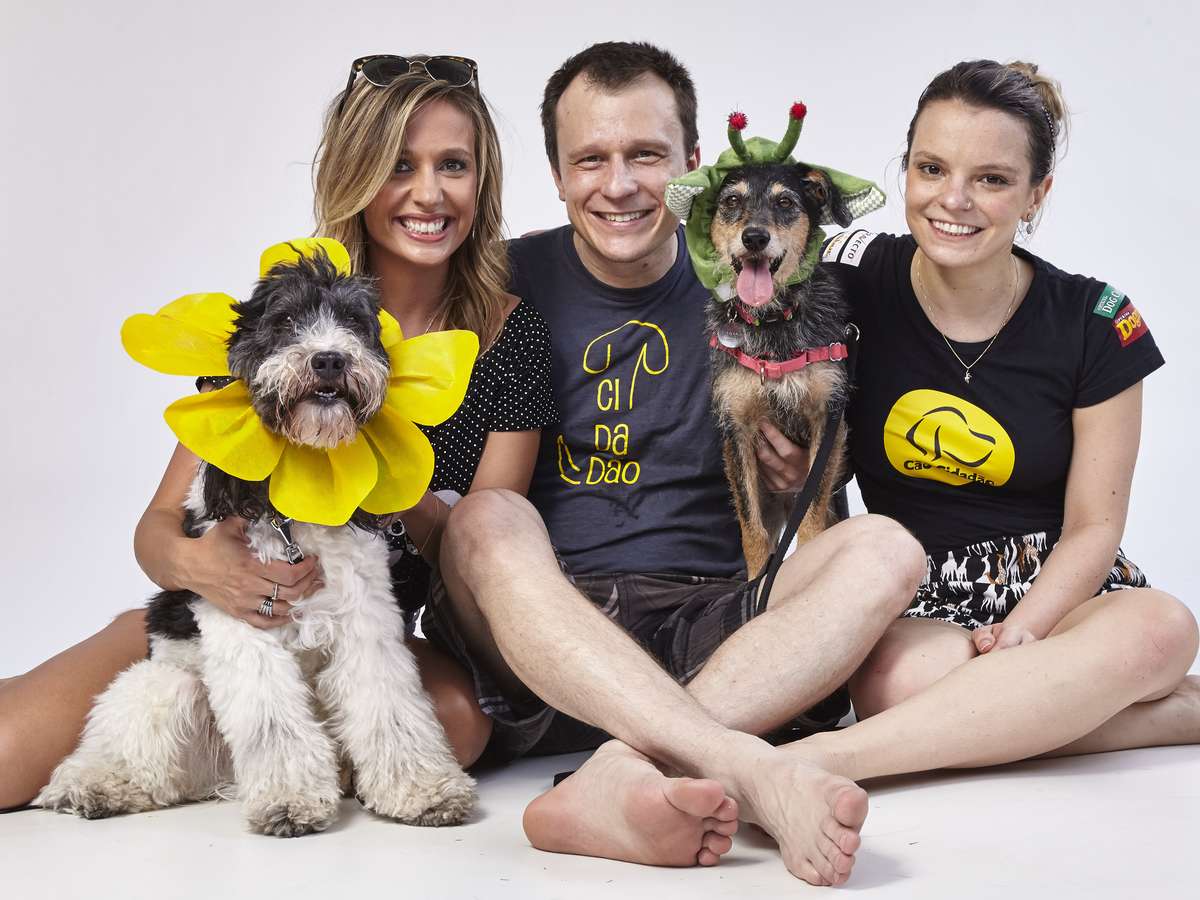 Luisa Mell, um dos petmons e a família Rossi, o especialista em comportamento animal Alexandre Rossi, sua esposa Cynthia Macarrão e Estopinha.