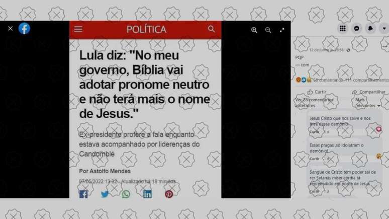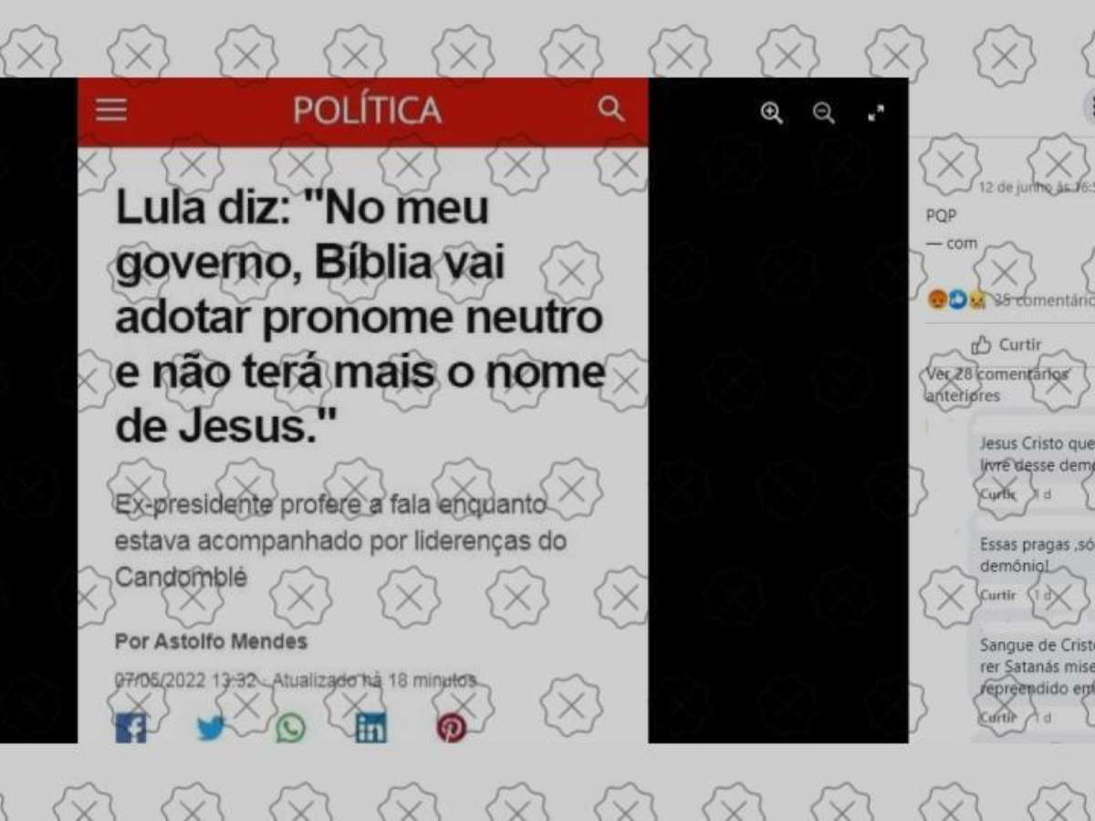 Postagens enganam ao compartilhar uma reprodução de uma notícia com a frase "Lula diz: 'No meu governo, Bíblia vai adotar pronome neutro e não terá mais o nome de Jesus'". A imagem simula o design do site G1, do Grupo Globo, que nega ter publicado a reportagem. Não há registros de que Lula tenha dito a frase, que também foi negada por ele em seu site oficial.