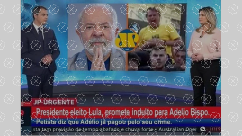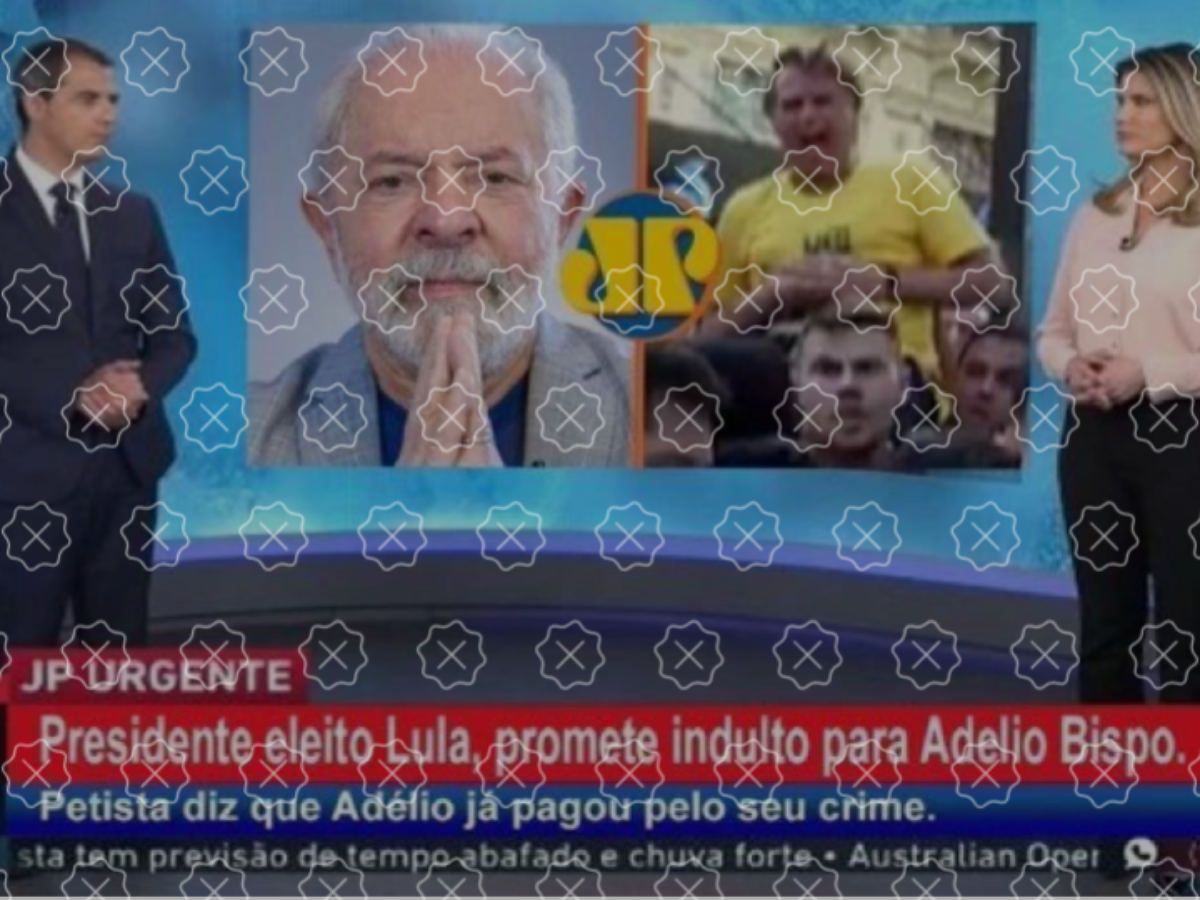 É montagem a imagem que vem sendo compartilhada nas redes e que mostra apresentadores da Jovem Pan diante de um telão com um texto dando conta de que o presidente eleito, Luiz Inácio Lula da Silva (PT), teria concedido indulto a Adélio Bispo, autor da facada contra o presidente Jair Bolsonaro durante a campanha de 2018. Não há registro de que a emissora tenha veiculado o conteúdo nem de que o petista tenha prometido perdão a Bispo, que foi absolvido das acusações no Judiciário por ser inimputável.