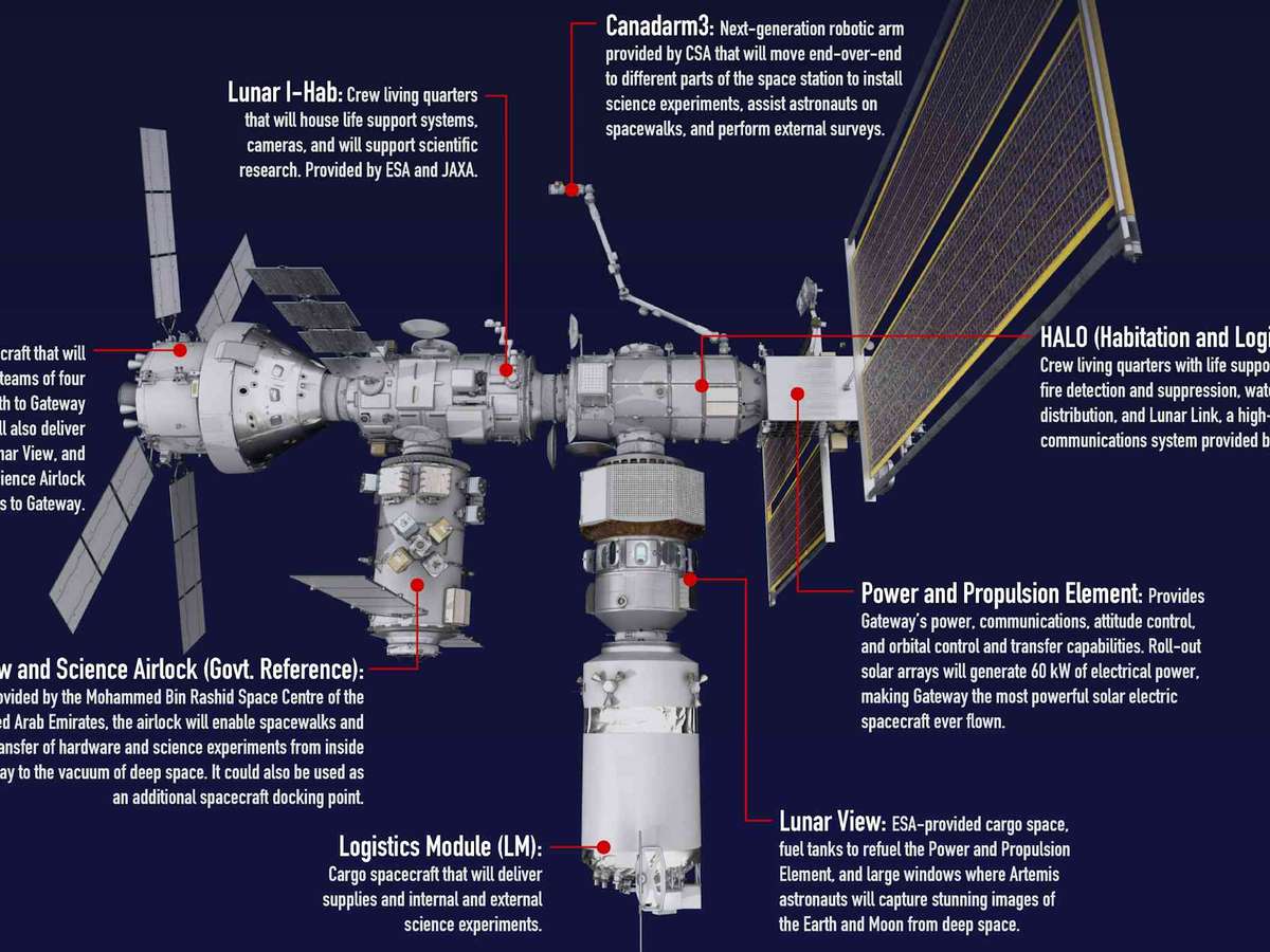 Esquema da estação Lunar Gateway.NASAA maioria dos componentes fornecidos por esses parceiros já foi produzida e entregue aos EUA para integração e testes. Mas o projeto tem sido afetado pelo aumento dos custos e debates persistentes sobre seu valor.