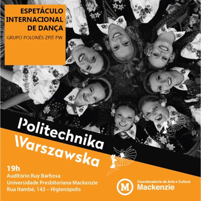 Na próxima quinta-feira (19), a Coordenadoria de Arte e Cultura (CAC) do Instituto Presbiteriano Mackenzie (IPM) em parceria com a Warsaw University of Technology, realizam o "Espetáculo Internacional de Dança" composto pelo Conjunto de Canto e Dança da Politechnika Warszawska (Escola Politécnica de Varsóvia). Dirigido pelo coreógrafo Janusz Chojecki e formado por alunos dessa universidade, o número de dança será exibido no Auditório Ruy Barbosa (Rua Itambé, 143 - Higienópolis - SP), a partir das 19h. Os ingressos serão distribuídos uma hora antes do evento até a lotação máxima do auditório.