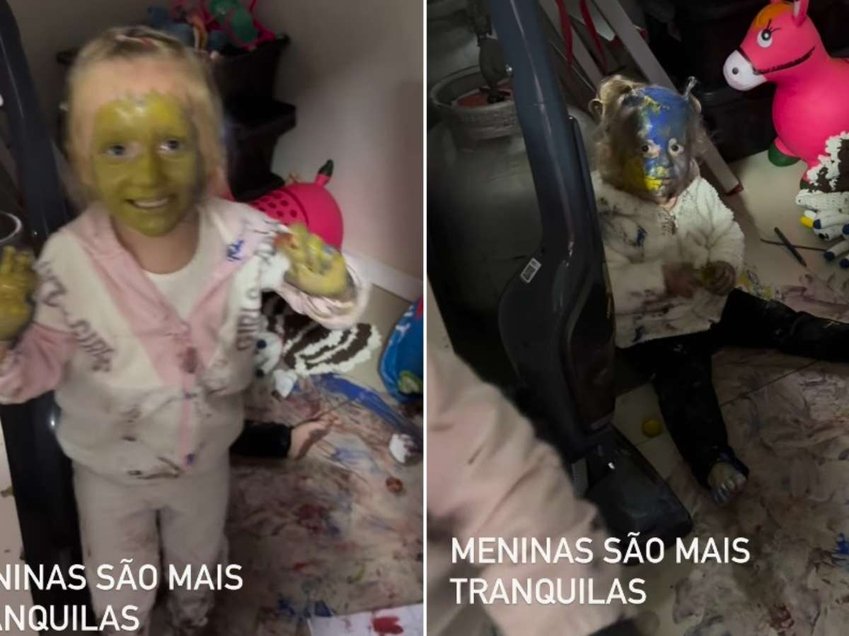 Mãe de Arroio do Sal, RS, viralizou ao compartilhar vídeo de suas filhas pequenas transformando a casa em uma "obra de arte" com tintas, gerando reações divertidas nas redes sociais.