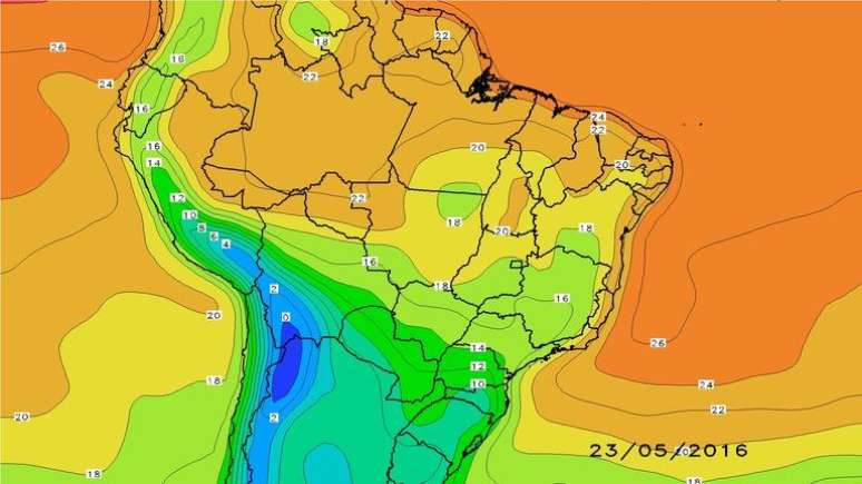 A expectativa é que o ar frio avance com mais força pelo interior do Centro-Oeste e do Sudeste. Esta dose de ar polar deve começar a ser sentida no Brasil após o dia 22 de maio. Mas o frio de maio não para por aí! As simulações atmosféricas feitas nesta quarta-feira, 18 de maio, indicam outra forte massa polar para os últimos dias do mês. O fim de maio e o início de junho poderão ser gelados.