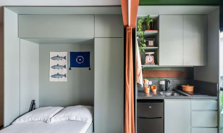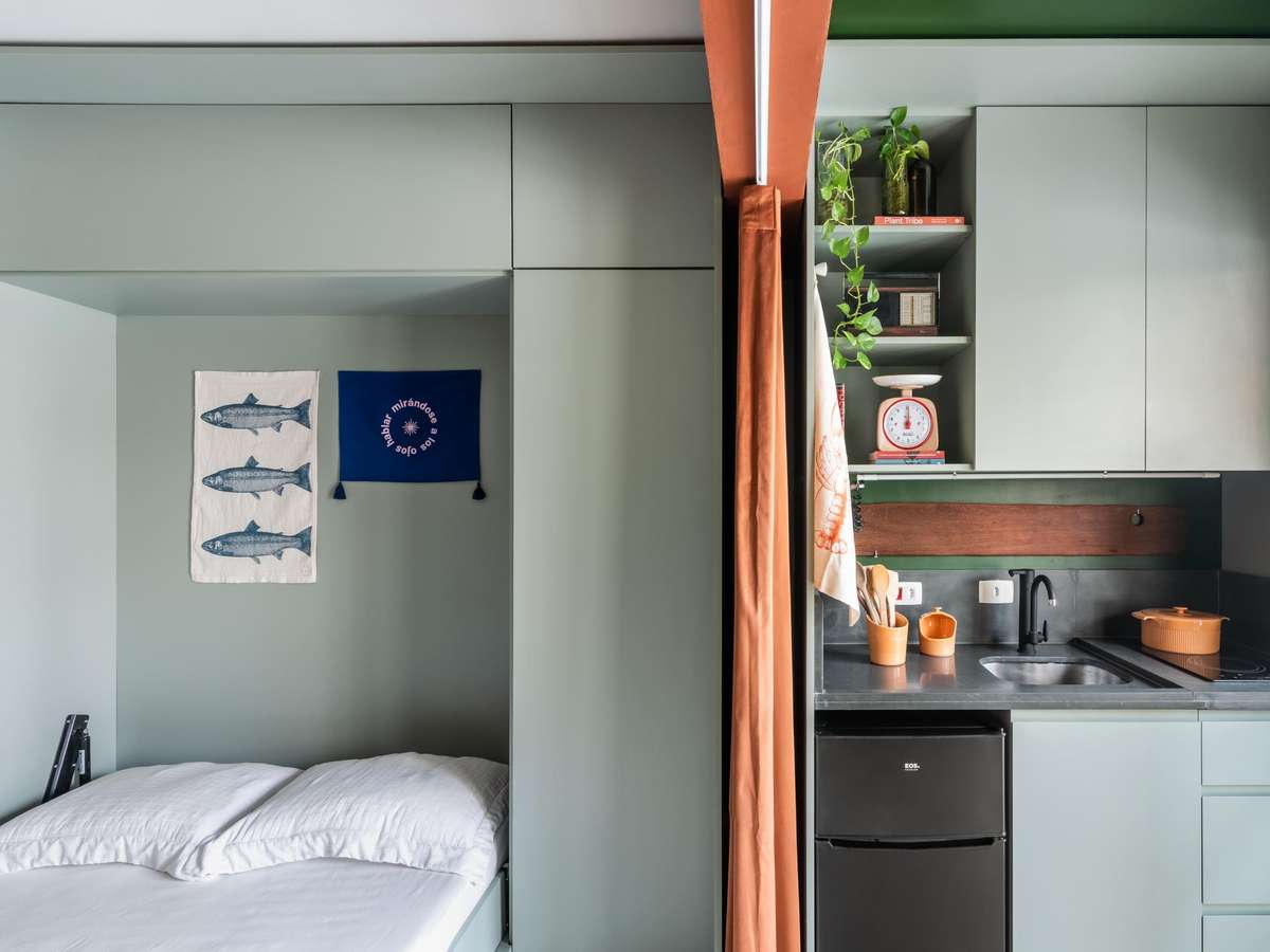 Com a redução da metragem, cresce também a demanda por soluções de mobiliário planejado. Um exemplo recente é o projeto de um estúdio de 25 m² no bairro da Pompeia, desenvolvido pelo escritório Fetiche Design, de Paulo Biacchi e Carolina Armellini. A proposta reorganizou o espaço por meio de marcenaria multifuncional, redistribuição dos ambientes e uso estratégico de cores.