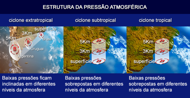 Todos eles são sistemas de baixa pressão atmosférica onde o ar se movimenta no sentido horário, no Hemisfério Sul, e no sentido anti-horário no Hemisfério Norte. Veja as diferenças entre eles, com explicações do meteorologista Luiz Felipe Gozzo.