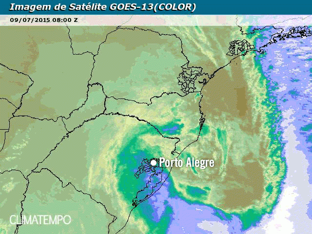 O ciclone extratropical é a região onde se vê bandas de nuvens enroladas, como um caracol. Nesta imagem temos um na costa do Chile e outro entre o Rio Grande do Sul e o Uruguai.