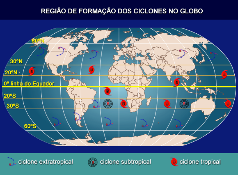 Cada tipo de ciclone tem uma região preferencial de formação no globo. Os tropicais em geral se formam na faixa de latitude entre 20° ao sul (20°S) e 20° de latitude norte (20°N). Entre 20° e 30°, nos dois hemisférios, podemos ter a formação dos ciclones tropicais, subtropicais e também extratropicais. Nas latitudes maiores do que 30°S e 30°N temos apenas os ciclones extratropicais. No Hemisfério Sul, a Antártica é "mãe" de quase todas as frentes frias e dos ciclones extratropicais associados a cada uma delas.