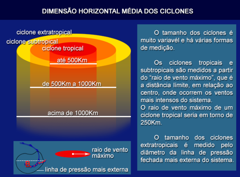 Os ciclones subtropicais têm tamanho horizontal menor do que os extratropicais e podem causar condições de tempo severo em regiões localizadas. Os subtropicais, em geral provocam volumes de chuva e ventos mais elevados do que os extratropicais.
