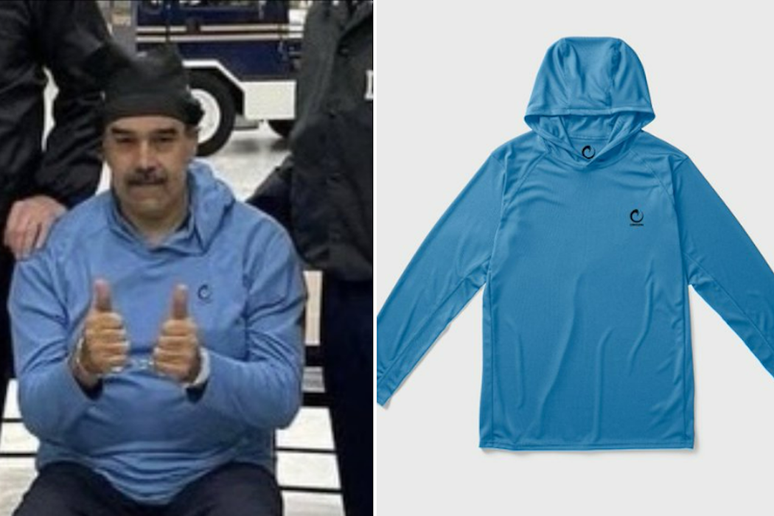 O texto era acompanhado por uma composição visual eloquente: de um lado, uma fotografia do líder venezuelano algemado, vestindo o moletom azul; do outro, a imagem do mesmo produto, tal como é comercializado no site da empresa. A relação entre o acontecimento político e o objeto de consumo não era explicada além da irônica "boas-vindas" aos Estados Unidos dirigida a Maduro, mas era imediata para qualquer leitor familiarizado com a atualidade.