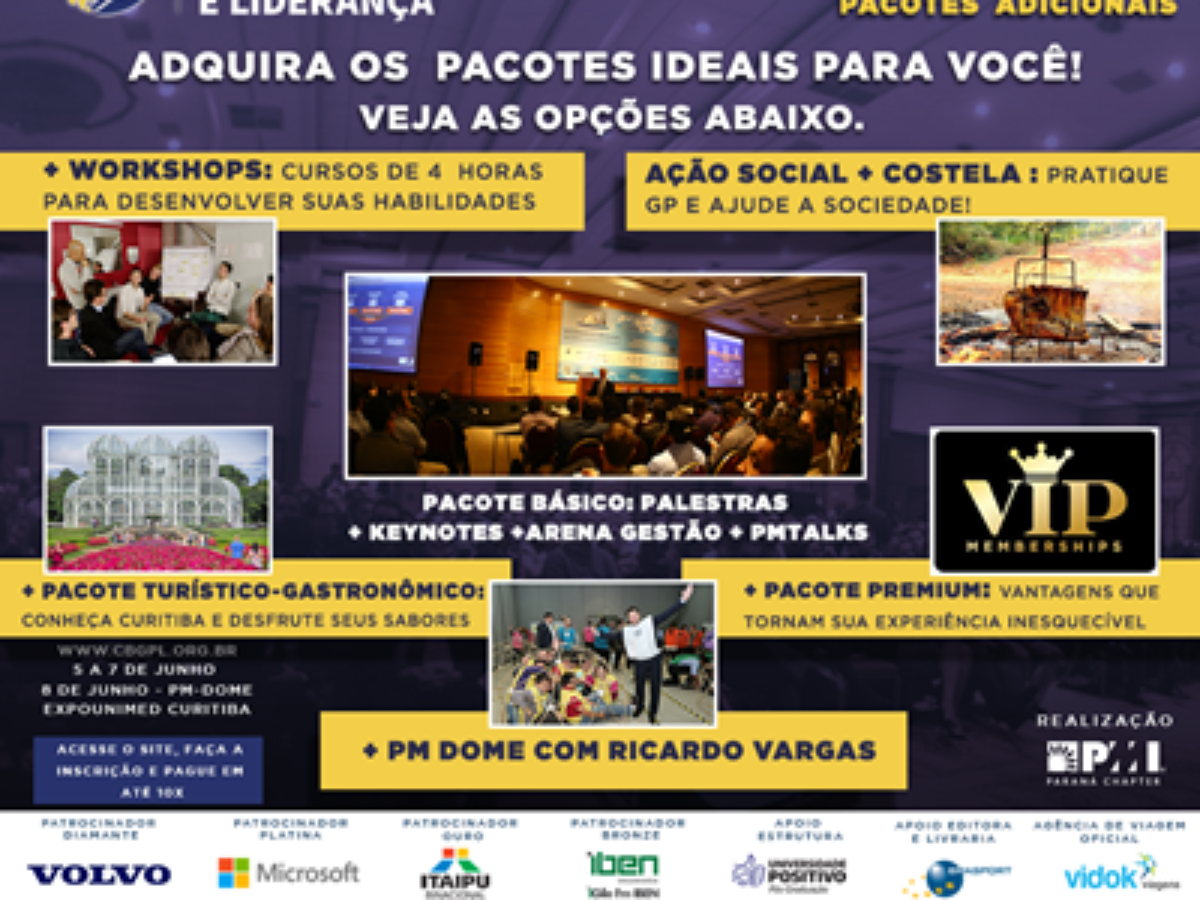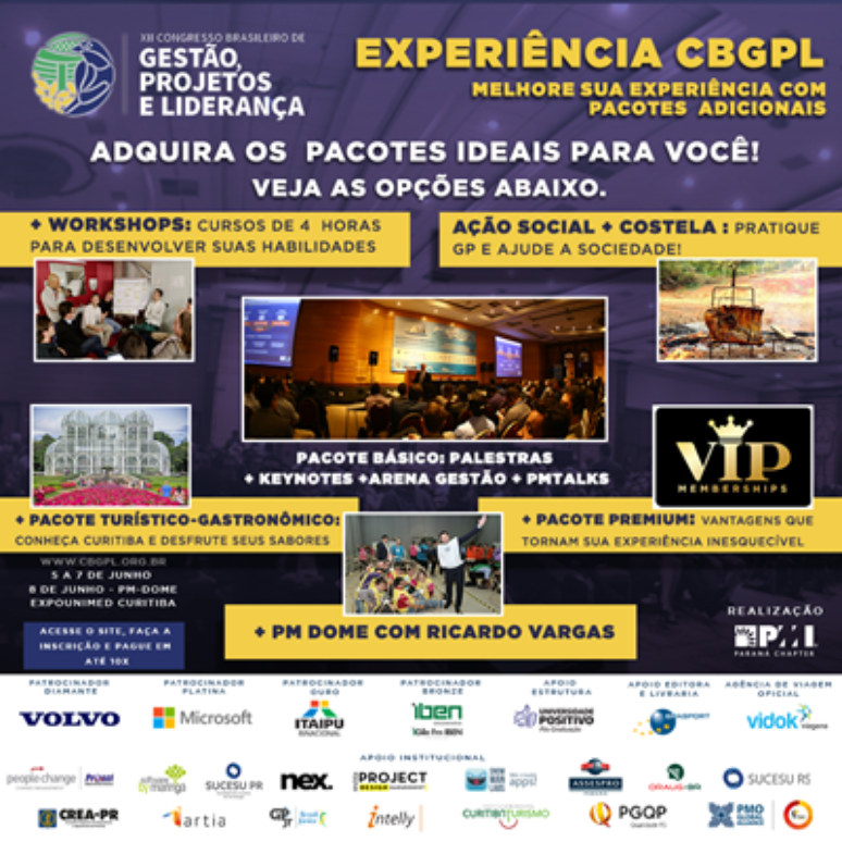 O XII Congresso Brasileiro de Gestão, Projetos e Liderança oferta diversas atividades aos seus participantes: palestras, diversos workshops (incluindo o renomado workshop PM Dome com Ricardo Vargas), networking, ação social, passeio turístico e gastronômico em Curitiba, pacote premium e muito mais!
