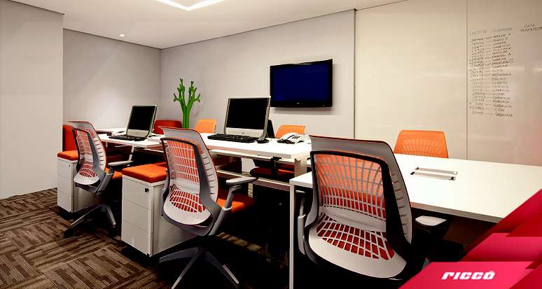O mais comum para esse tipo de ambiente são as bancadas que, como dito anteriormente, promovem um trabalho mais colaborativo entre os funcionários e otimizam espaço.