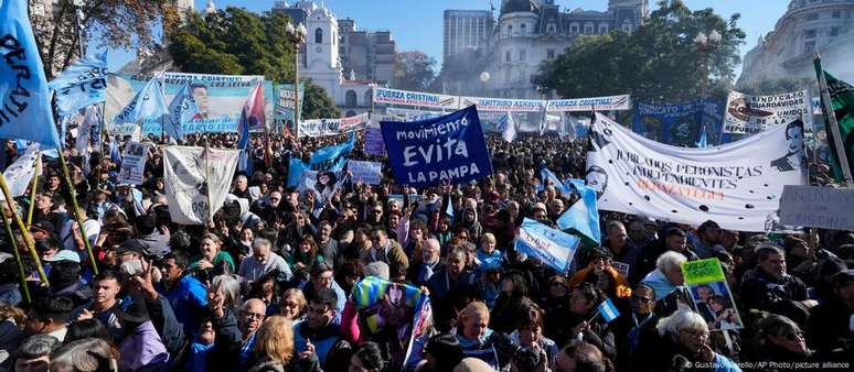 Os manifestantes se concentraram na Plaza de Mayo, em Buenos Aires, em frente à casa do governo, e se espalharam pelas ruas vizinhas em uma manifestação convocada pelo Partido Justicialista (PJ), presidido por Kirchner, duas vezes presidente (2007-2015) e uma vez vice-presidente (2019-2023) da Argentina.
