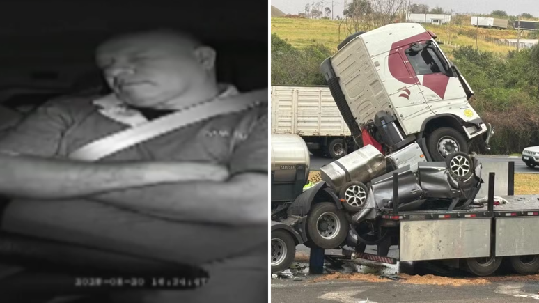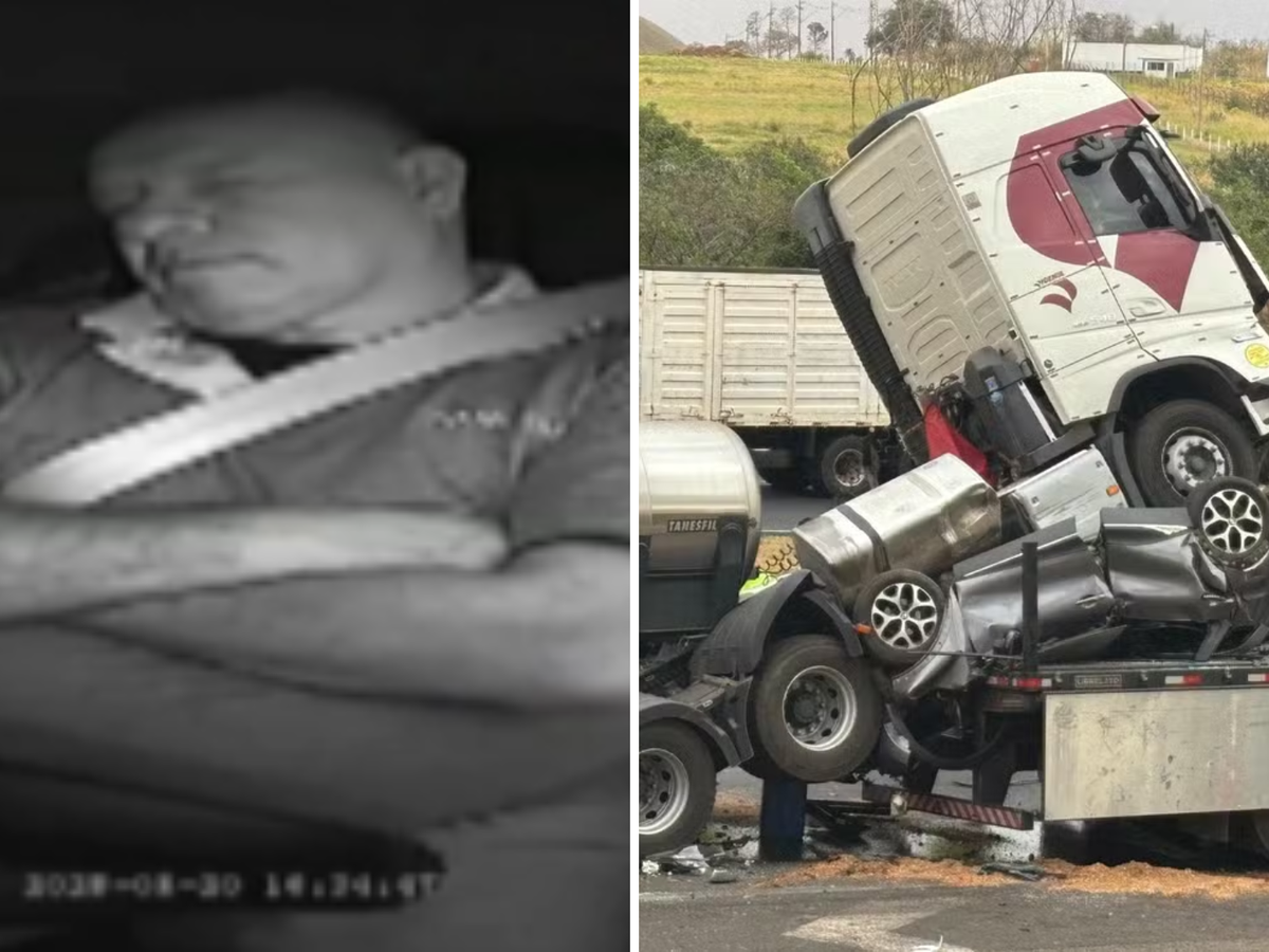 O motorista de carreta Aureliano Antonio Messias, de 58 anos, foi afastado de suas funções após ser flagrado cochilando segundos antes de um grave acidente que resultou na morte do advogado Gláucio Rogério Gonçalves Gouveia, de 51 anos. O episódio aconteceu na última quarta-feira (20), na Rodovia Washington Luís (SP-310), em São José do Rio Preto, e as imagens do veículo de carga revelaram em detalhes o momento da colisão. As câmeras da carreta registraram a cena em cinco ângulos diferentes, mostrando o instante em que o condutor, de braços cruzados e olhos fechados, perde a atenção e avança contra o carro que estava parado no congestionamento.