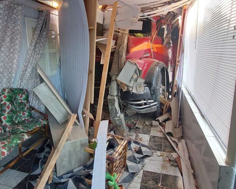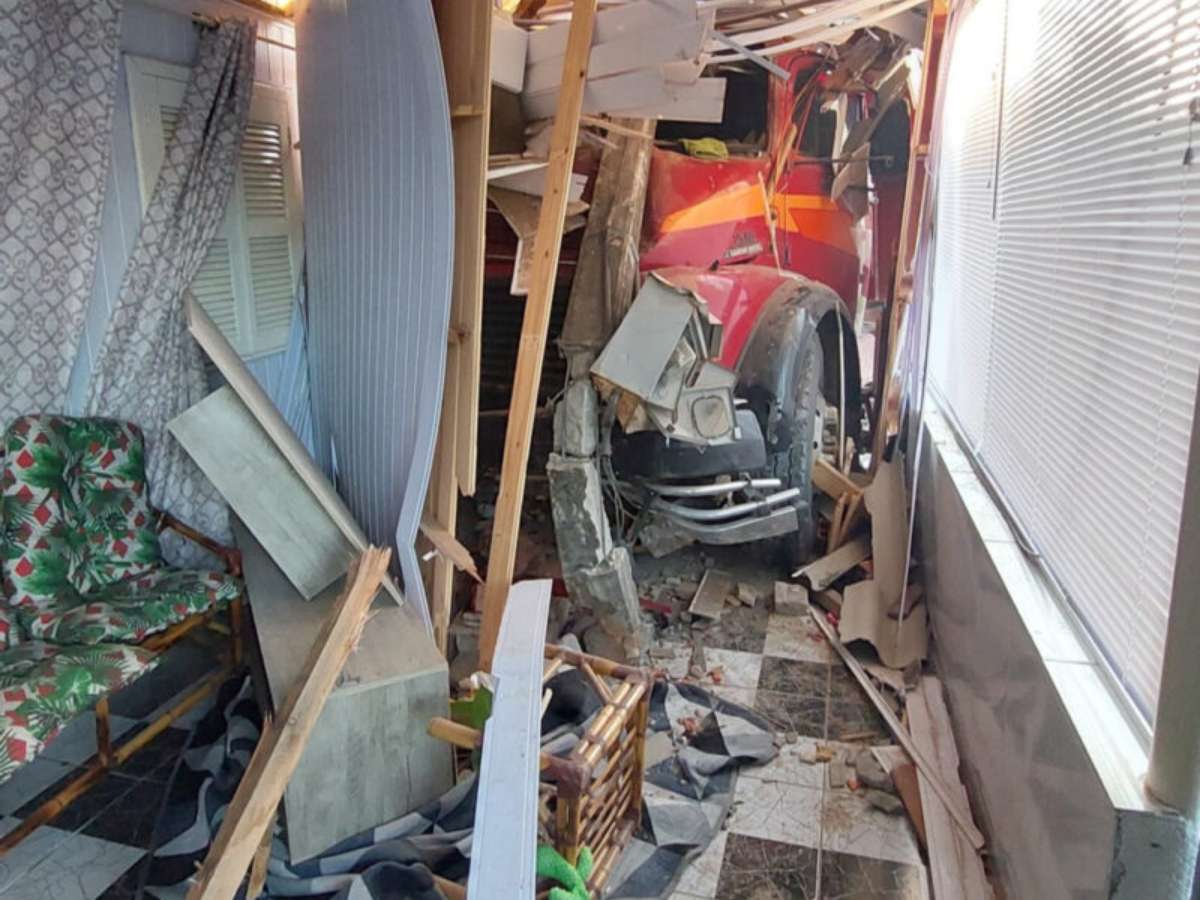 Veículo, carregado com grãos de arroz, perdeu o controle e causou danos à casa; moradores não se feriram