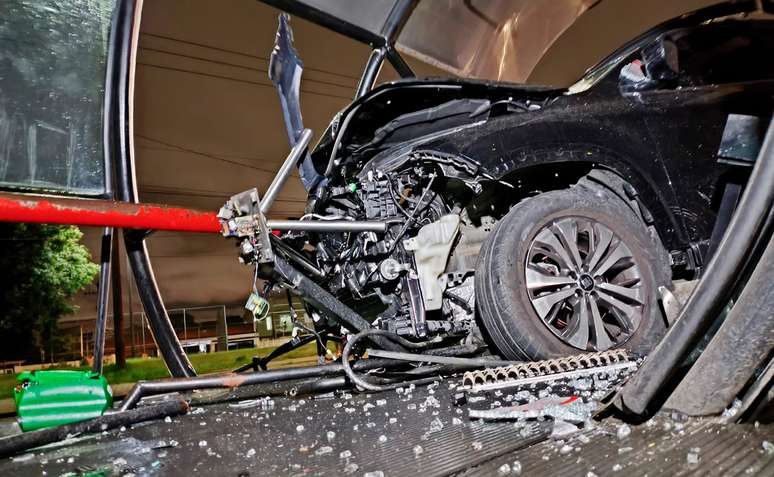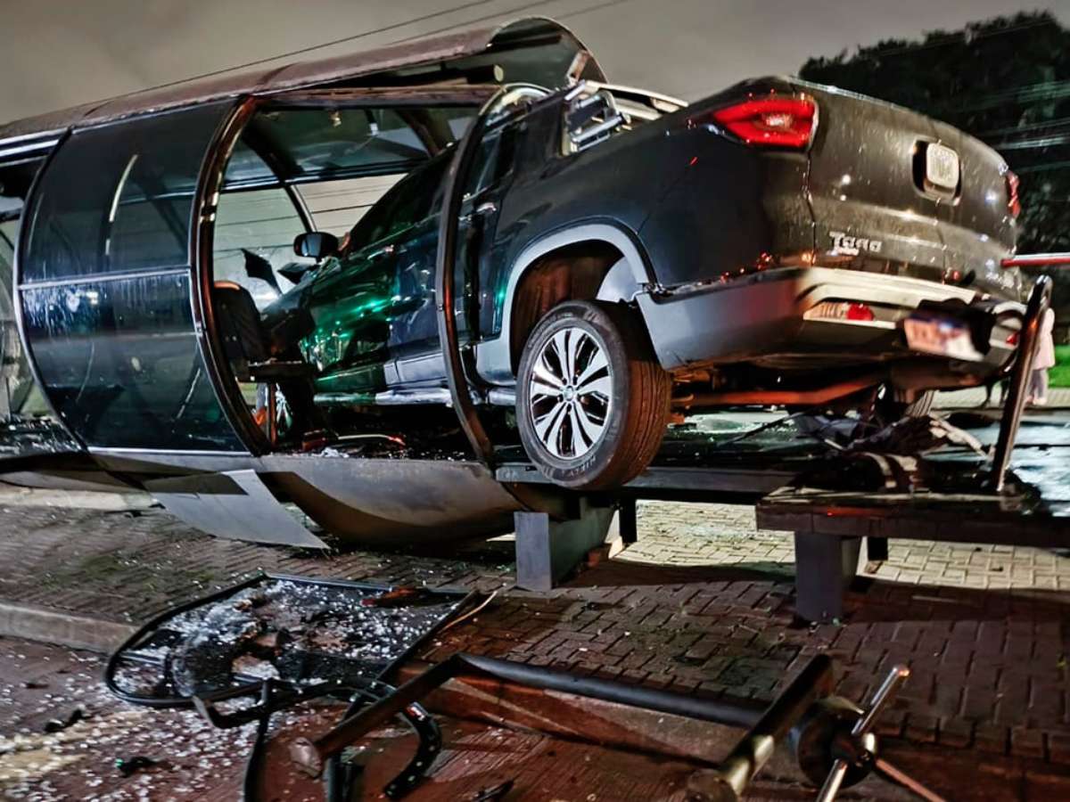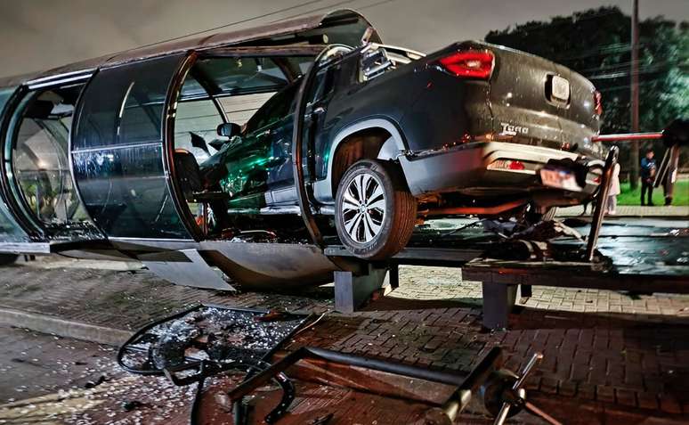Com uma Fiat Toro, um motorista invadiu uma estação-tubo da Avenida Presidente Affonso Camargo, no bairro Capão do Imbuia, em Curitiba. O acidente aconteceu no começo da madrugada desta terça-feira (14). Com a desculpa de que iria atrás do cachorro dele que saiu do carro, o homem fugiu do local.