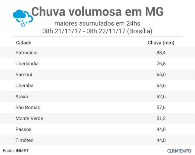 Chuva volumosa em Minas Gerais entre 21 e 22 de novembro de 2017