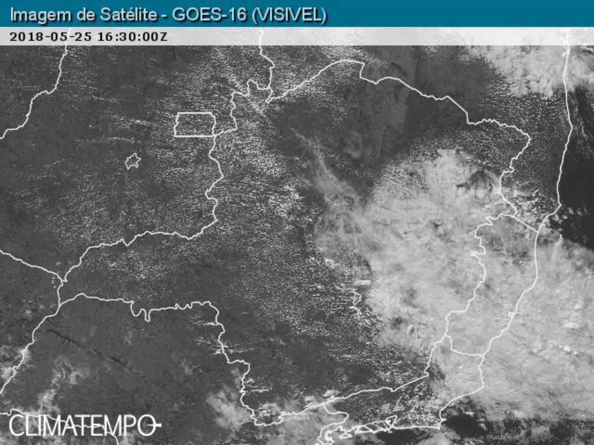 Na imagem de satélite captada pelo satélite GOES 16 é possível perceber o contraste de umidade sobre Minas Gerais às 13h30 (Brasília) de 25/5/2018. As áreas com muita umidade são representadas por manchas em tons de cinza. As regiões com pouca umidade aparecem em tons de preto.