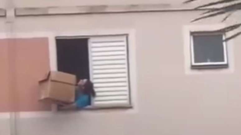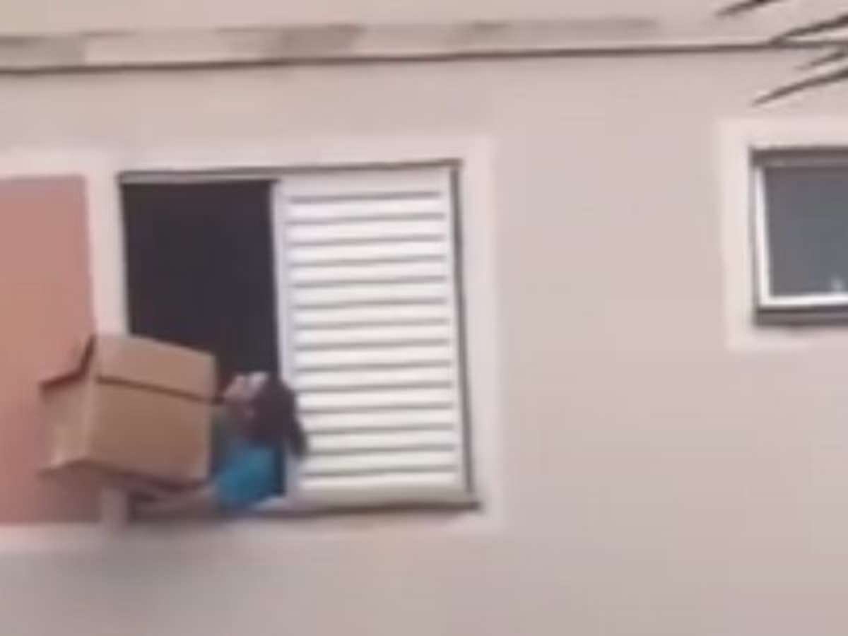 Mulher usa caixa de papelão para salvar cachorro de queda da janela; veja o vídeo