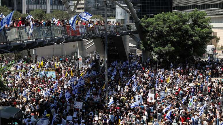 As manifestações, que ocorrem em todo o país, pedem que o governo concorde com um acordo para garantir a libertação dos reféns mantidos pelo Hamas.