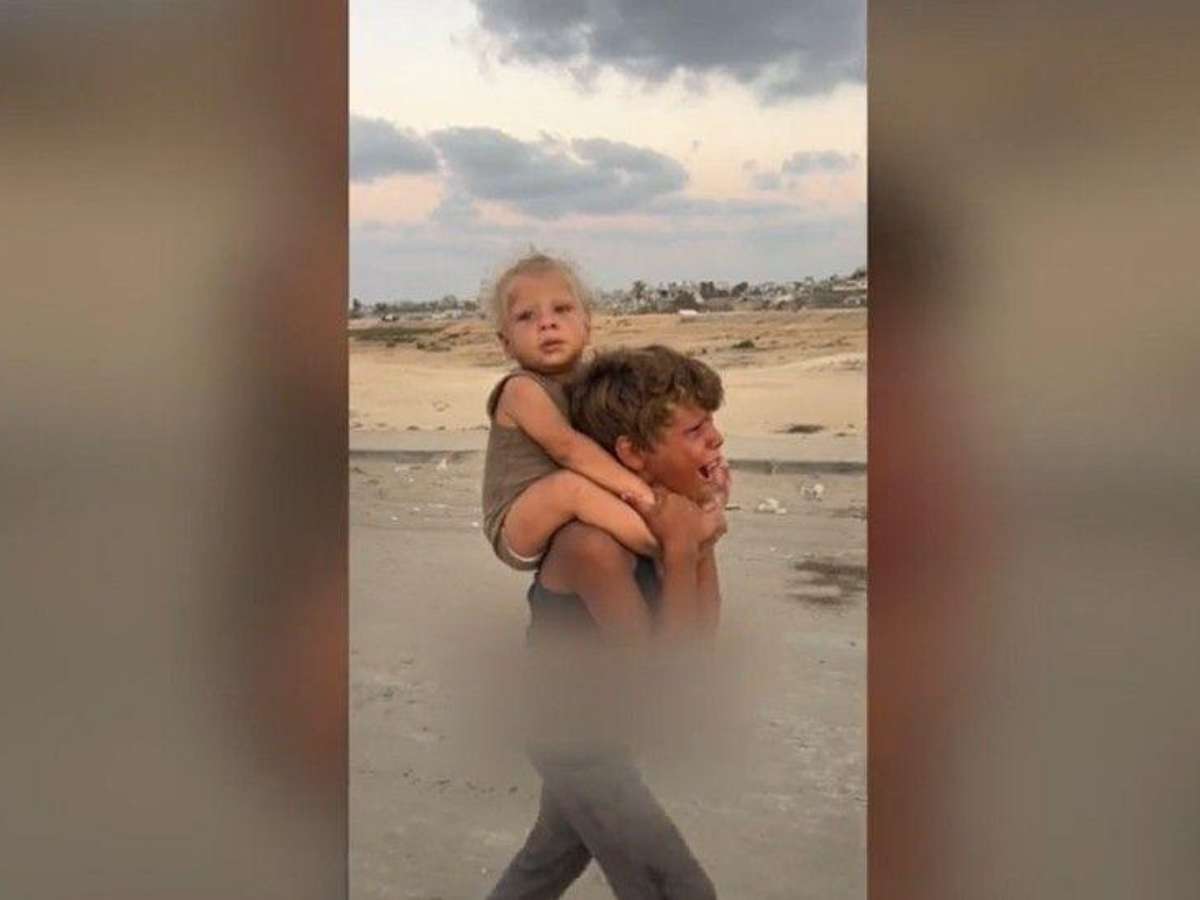Jadoua, de 8 anos, carrega seu irmão Khaled, de 2 anos. O vídeo registra o momento em que as crianças fogem após serem separadas dos pais em meio a um bombardeio, após a ordem do exército de Israel para evacuar a Cidade de Gaza.