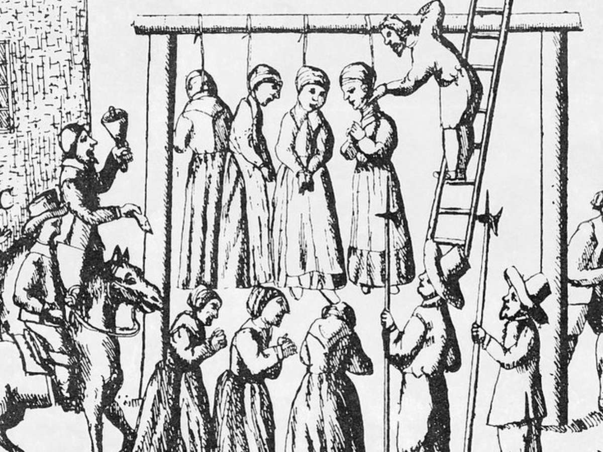 Apesar de a morte na fogueira ser comum na Europa na época, na Inglaterra os condenados por bruxaria eram executados na forca.