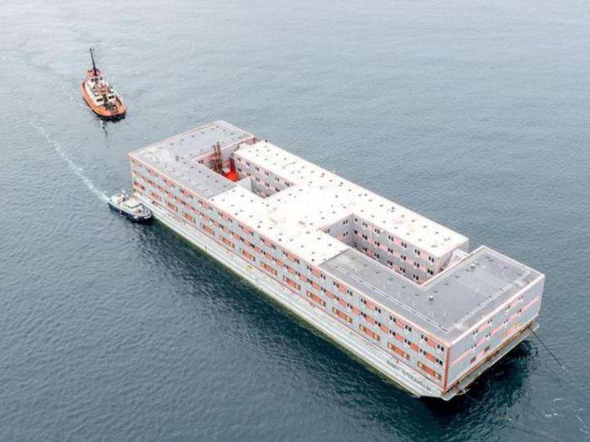 Na semana passada, a "Bibby Stockholm" foi retirada de um dique seco no porto de Falmouth, após uma reforma que permitirá acomodar até 500 homens solteiros, pelo menos nos próximos 18 meses.