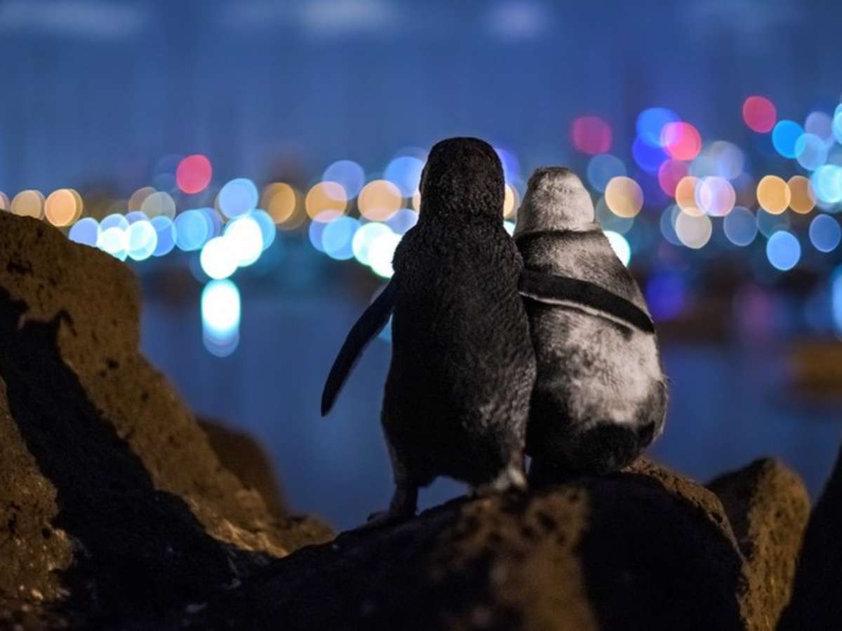 A premiada foto de pinguins viúvos que parecem se confortar sob as luzes da cidade