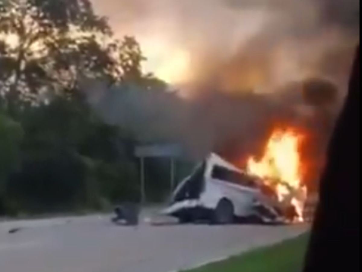 Após a colisão, a van foi consumida pelas chamas e ficou caída na rua, como mostram imagens da imprensa local.