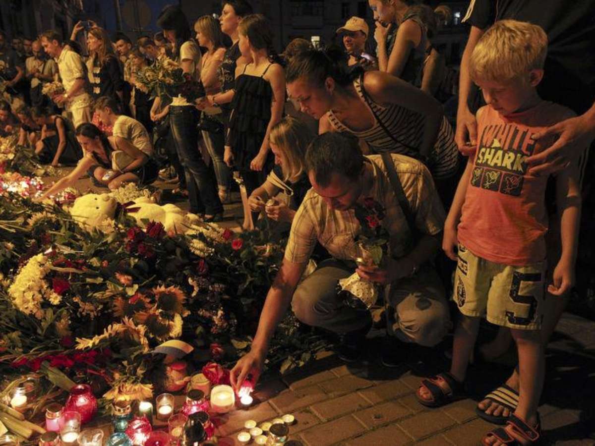População deposita flores e velas em frente à embaixada da Holanda para homenagear as vítimas da queda do avião da Malaysia Airlines, em Kiev, na Ucrânia, nesta quinta-feira. 17/07/2014