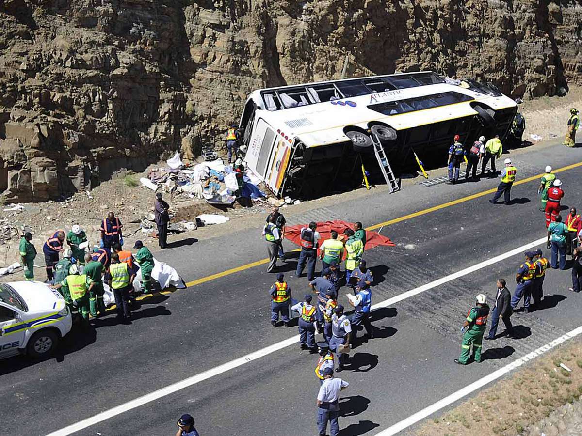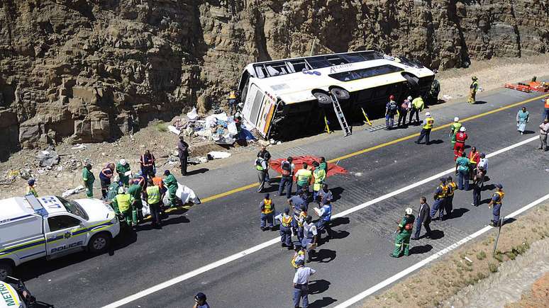 O ônibus, de dois andares, viajava em direção à capital da província, Cidade do Cabo, e bateu em um barranco após o motorista perder o controle do veículo.