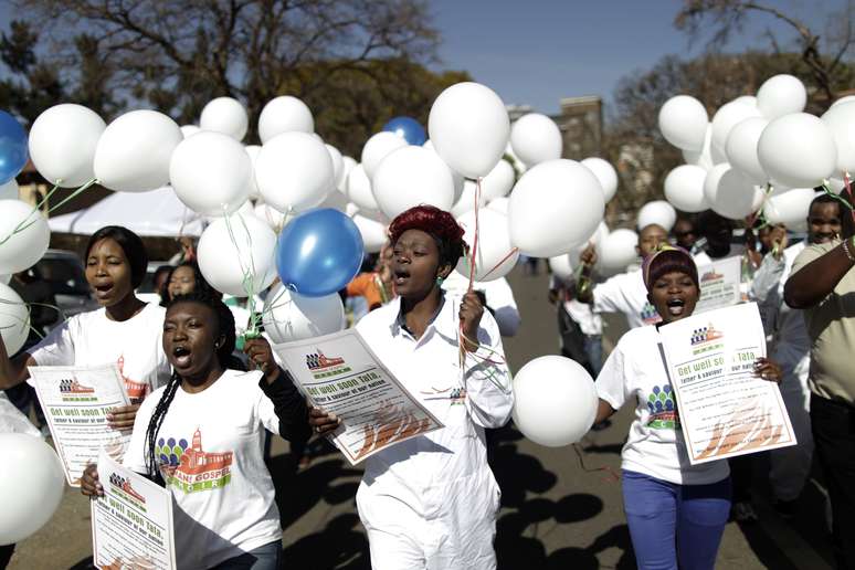 28 de junho - Com balões, cidadãos rezam nas proximidades do hospital onde Mandela está internado em estado crítico