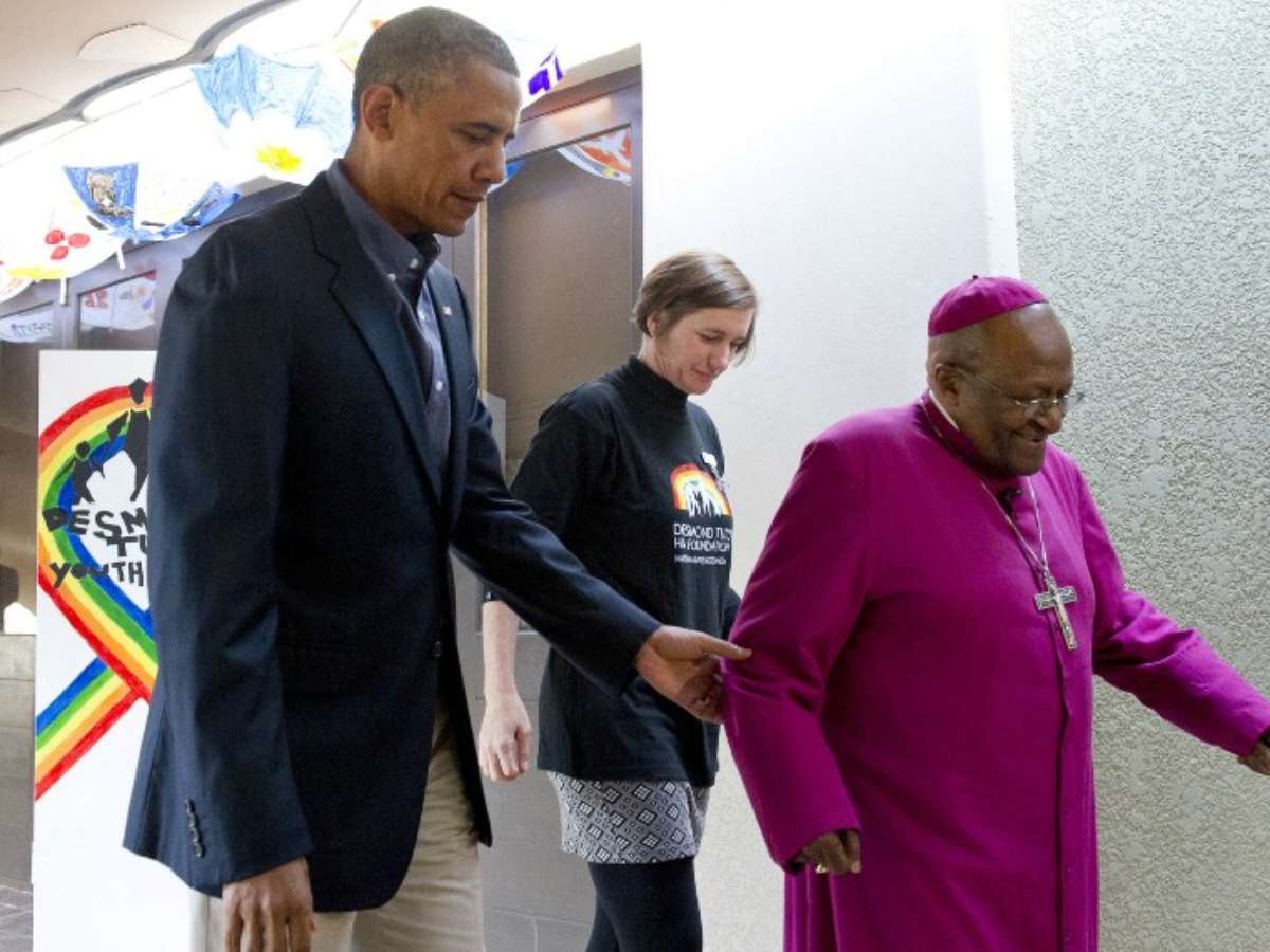 O presidente americano Barack Obama conversa com Desmond Tutu após visitar cela onde Nelson Mandela ficou preso
