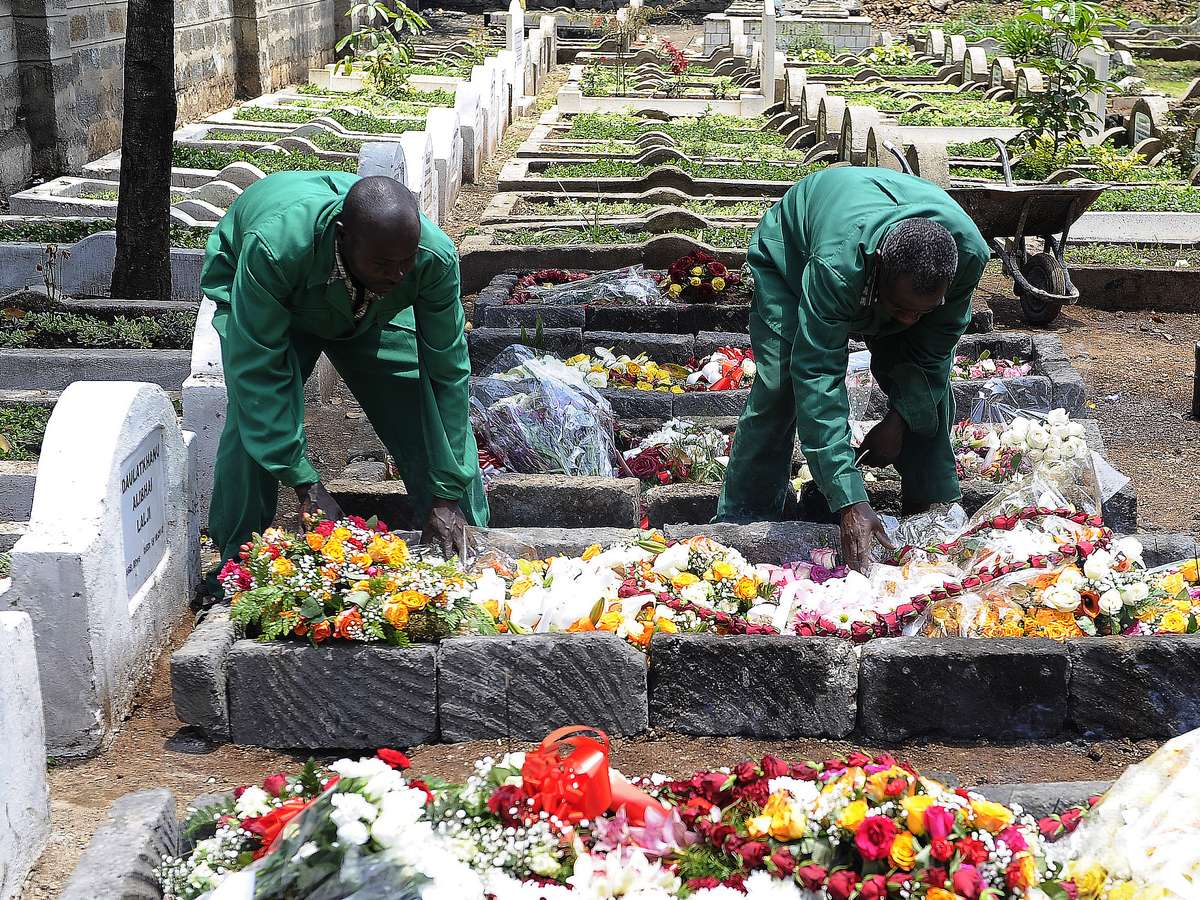 Funcionários de um cemitério da capital do Quênia colocam flores em uma das sepulturas