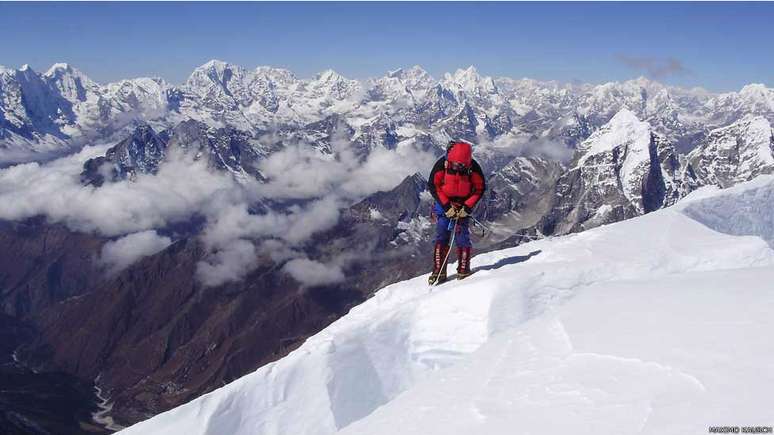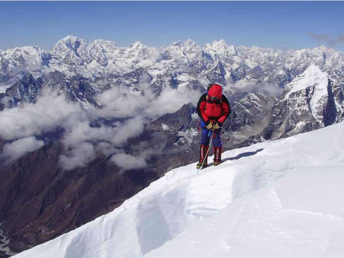 Mesmo com o apoio de guias, carregadores e cozinheiros, nem sempre o montanhista que contrata uma expedição comercial chega ao cume. Nessa foto, um cliente de uma expedição guiada por Maximo começa a descida do Ama Dablam, uma montanha de alto grau de dificuldade no Nepal. Nesta expedição, em outubro de 2011, 12 clientes atingiram o cume da montanha