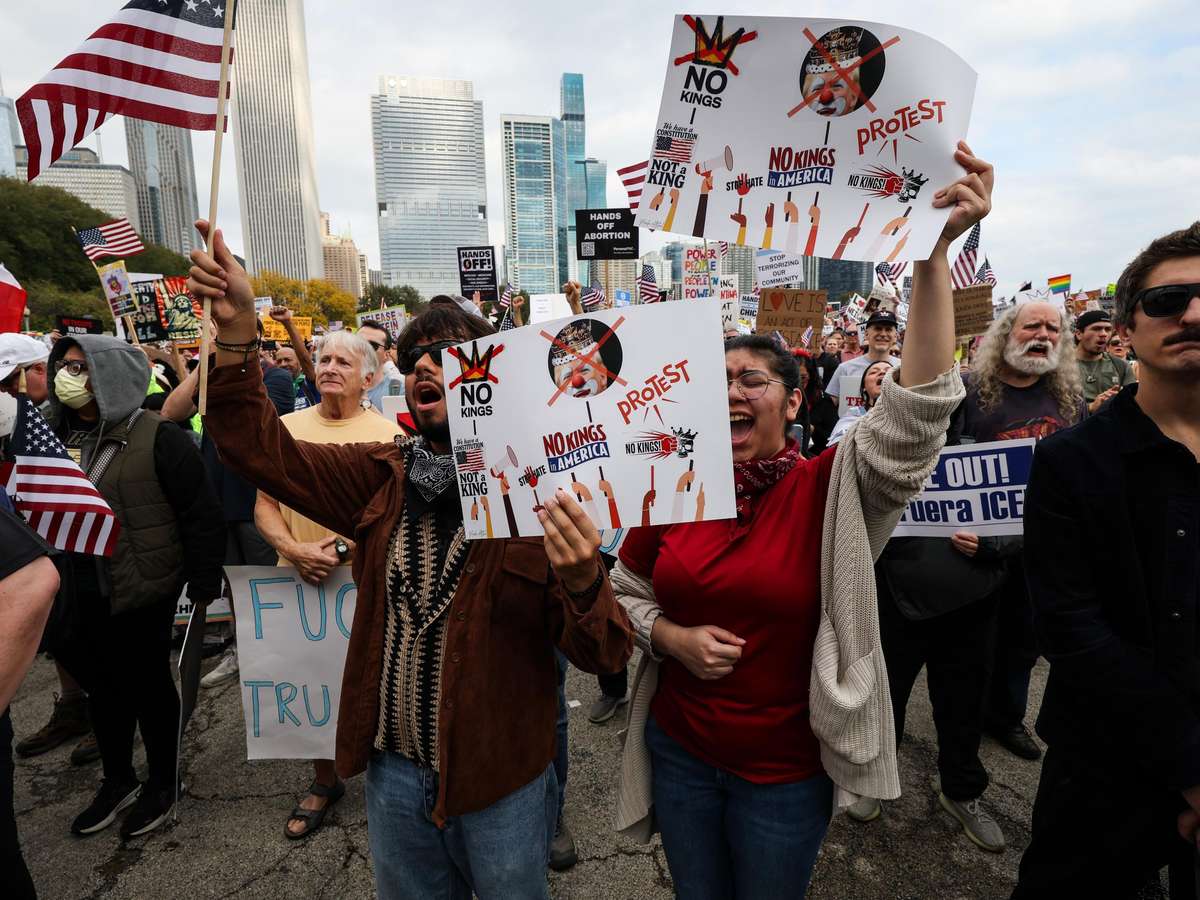 Reunidos sob o lema "Sem reis", milhões de americanos devem marchar para denunciar a "virada autoritária" do presidente republicano, anunciaram os organizadores. No bairro de Forest Hills, em Nova York, centenas de pessoas se reuniram no meio da manhã, entoando o slogan "Amamos nosso país, não suportamos Trump".