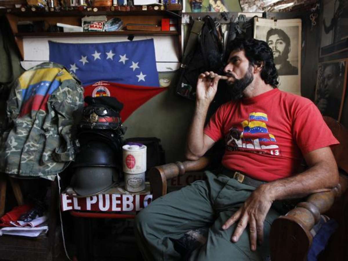 Ele carrega uma faca amarrada ao tornozelo, mostra um ferimento de bala e outras lesões e desfia detalhes de seu envolvimento em alguns dos eventos mais dramáticos no passado recente da Venezuela -- atacar a mídia de oposição, infiltrar-se em protestos, defender Chávez durante um breve golpe em 2002.