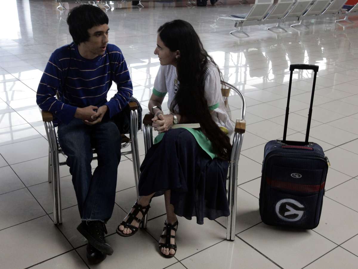 Dissidente cubana, Yoani Sanchez conversa com seu filho Teo Escobar antes de embarcar no aeroporto de Havana