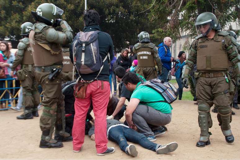 Com o rosto coberto, os manifestantes atiraram paus e pedras na polícia que, em grande número, resguardava desde cedo o centro de Santiago, constatou a AFP. Confrontos similares ocorreram em outras cidades do Chile, como Valparaíso e Concepción (sul).