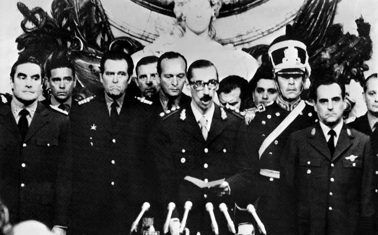 Imagem do dia 29 de março de 1976 mostra o general Jorge Videla (centro) prestando juramento como presidente da Argentina, após o golpe militar