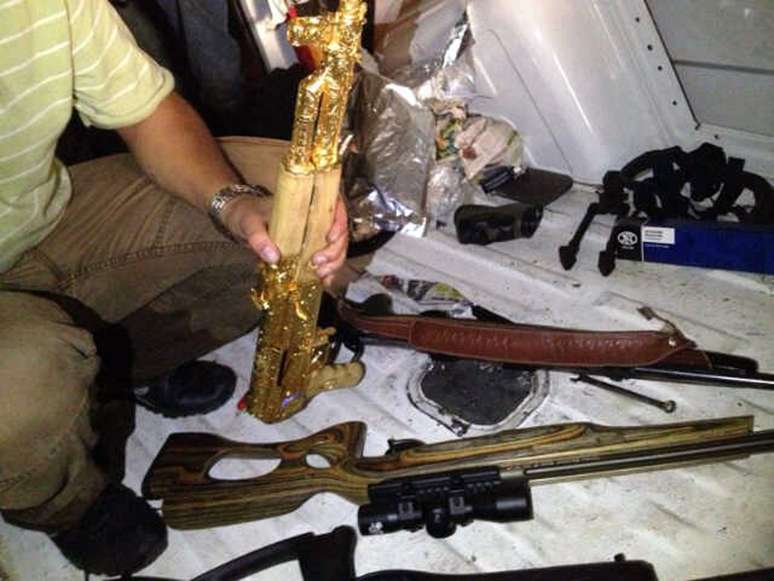Entre o arsenal, a polícia encontrou um fuzil AK-47 banhado a ouro e revestido de diamentes e esmeraldas