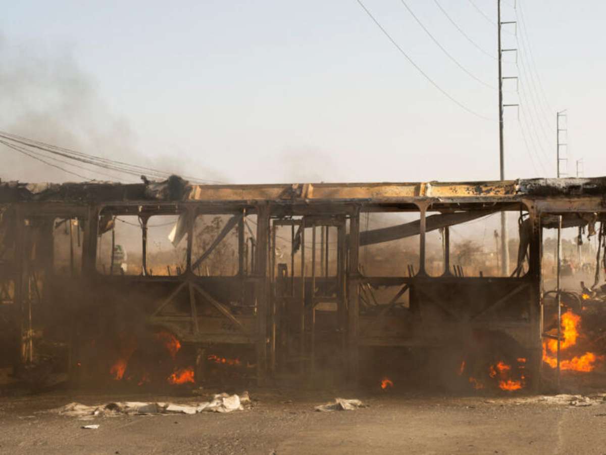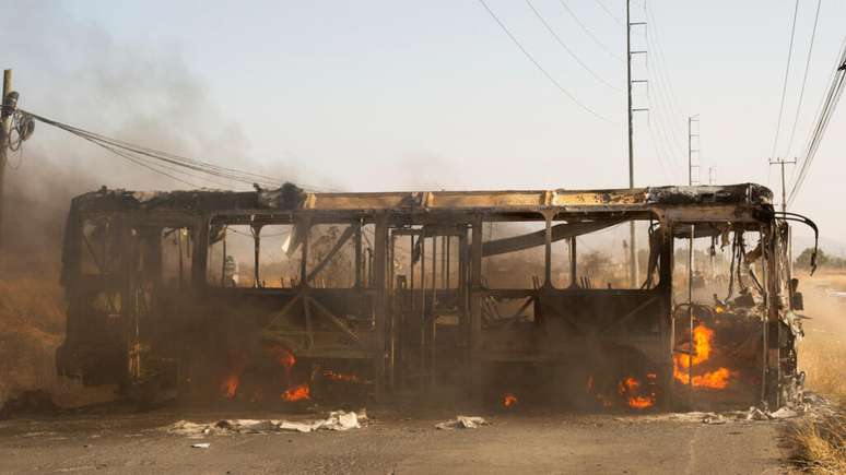 Homens armados bloquearam com carros e caminhões incendiados diversas vias de Jalisco. À tarde, eram visíveis restos de veículos carbonizados e outros ainda em chamas em várias rodovias, em meio ao som das sirenes das forças de segurança.