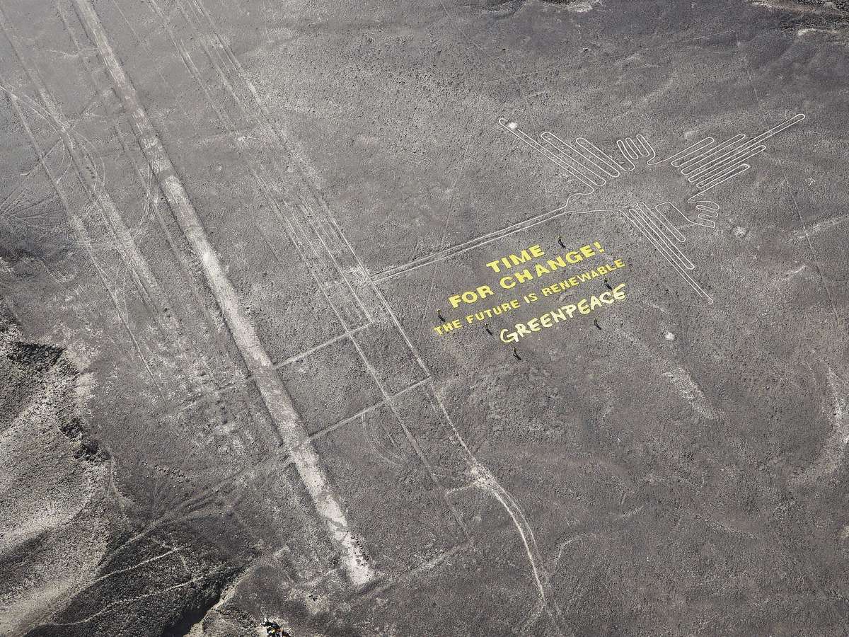Os ativistas formaram com panos as frases "É tempo de mudar! O futuro é renovável" perto da figura icônica Nazca de um beija-flor.