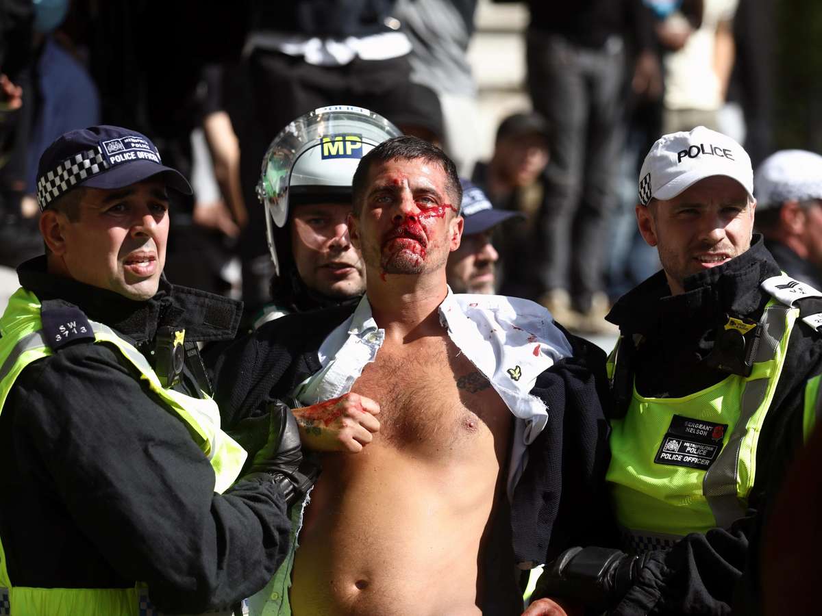 Na Trafalgar Square, a polícia separou dois grupos de aproximadamente 100 pessoas cada, um cantando "Black Lives Matter" e o outro ofensas racistas. Alguns grupos empurraram, jogaram garrafas e latas e dispararam fogos de artifício, enquanto a polícia, com cachorro e cavalos, alinhava-se.