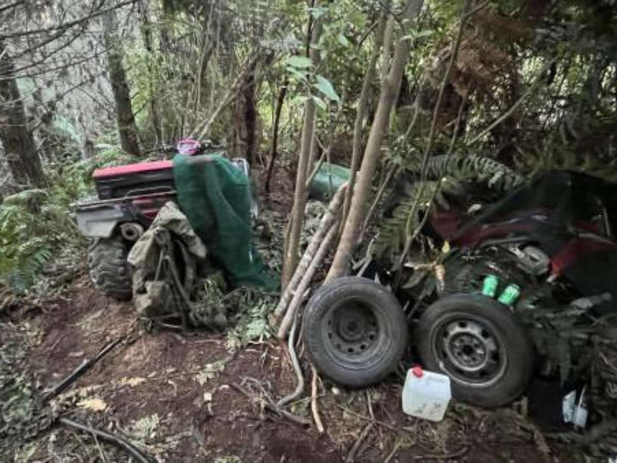 Um estoque de armas de fogo e munições também foi encontrado no acampamento, que é cercado por vegetação densa. Duas motos quadriciclos aparecem estacionadas entre as árvores.