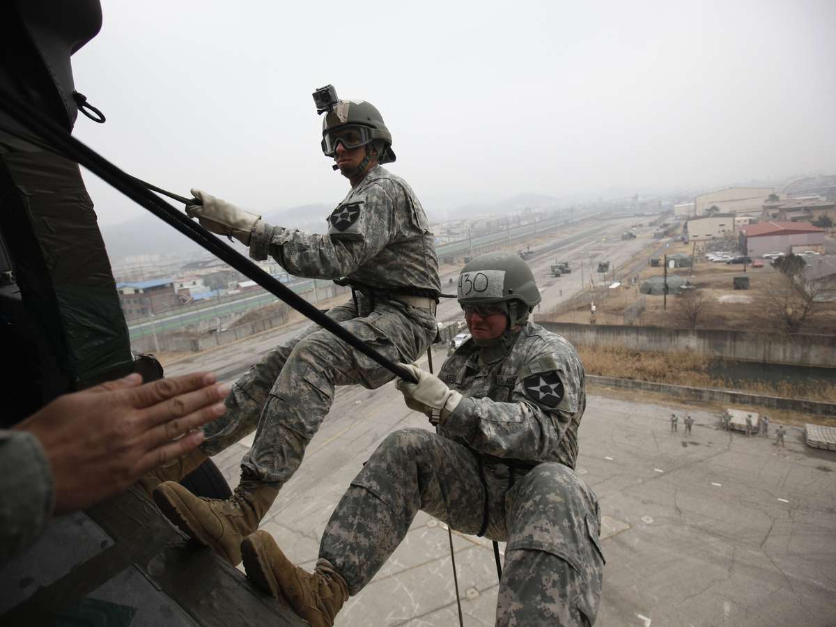 Soldados da 2ª Divisão de Infantaria dos Estados Unidos descem de helicóptero de rapel durante treinamento de assalto aéreo no campo Casey, situado em Dongducheon, ao norte de Seul, capital da Coreia do Sul
